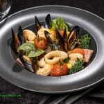 Creveți, scoici, tentacul de caracatiță, baby caracatiță, inele calamar, pâine prăjită, roșii, usturoi, unt