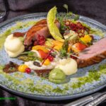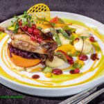Piept de rață, piure de țelină, sos de portocale, usturoi, rozmarin, unt