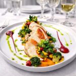 Piept de pui, piure de cartof dulce, unt, lapte de soia, salsa din fructe exotice