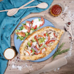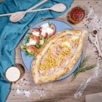 Blat pizza, șuncă, ciuperci, mozzarella, mix salată (salată verde, roșii, castraveți), sos alb