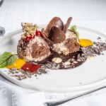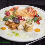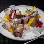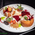 Foi de clătite, cremă de brânză, cremă de zmeură, sos de ciocolată negru