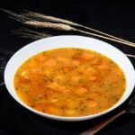 Cartofi, morcovi, țelină, măzăre, ceapă, fasole verde, conopidă, smântână vegetală, crutoane.