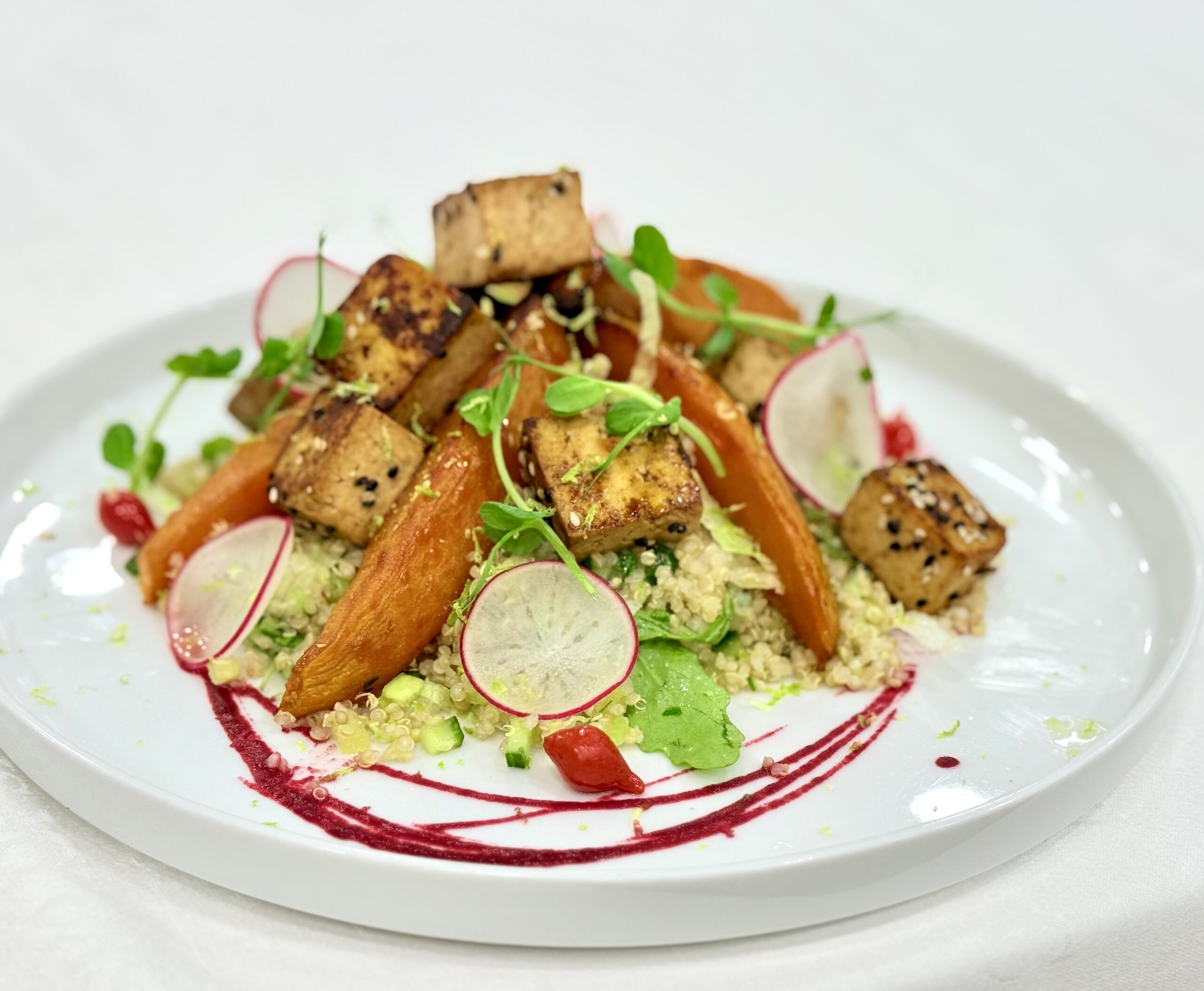 Conține: cartof dulce, tofu natur, quinoa, pastă Miso, tahini, miere, sos de soia, ulei de măsline, usturoi, susan alb/negru, zeamă de lime, castraveți