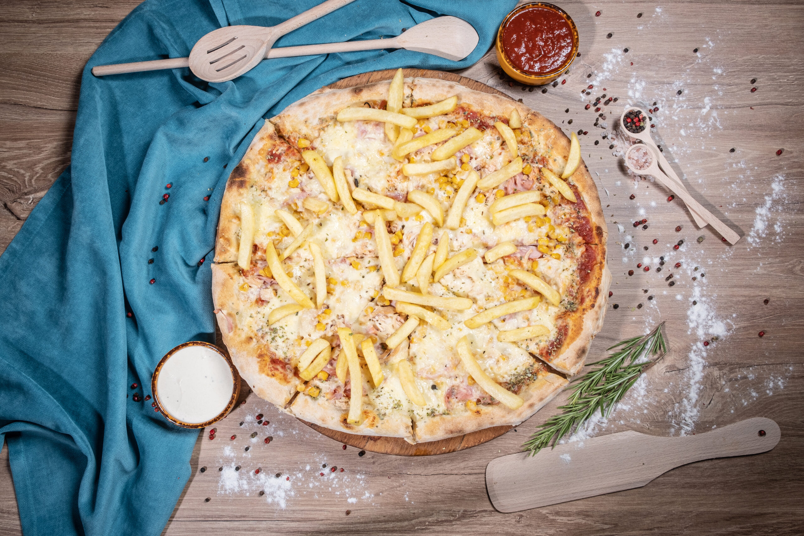 Blat pizza, cartofi prăjiți, piept de pui, șuncă, mozzarella, porumb, sos de roșii