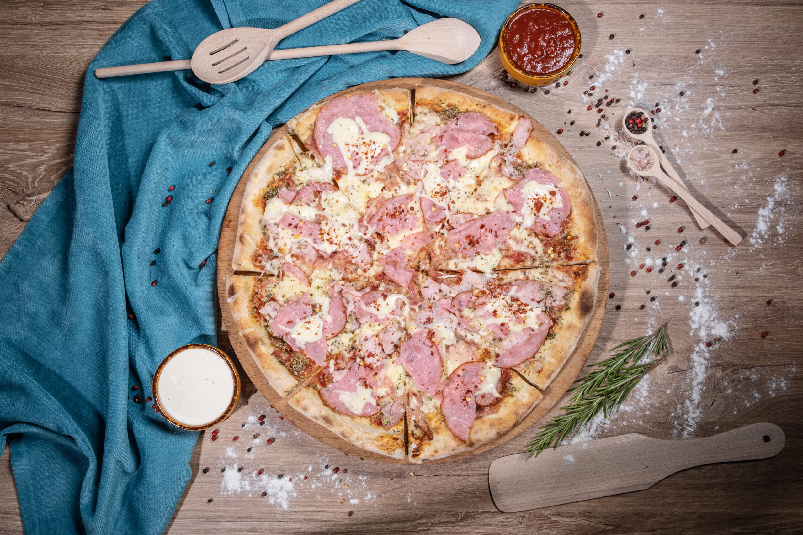Blat pizza, salam, bacon, mozzarella, sos de roșii picant