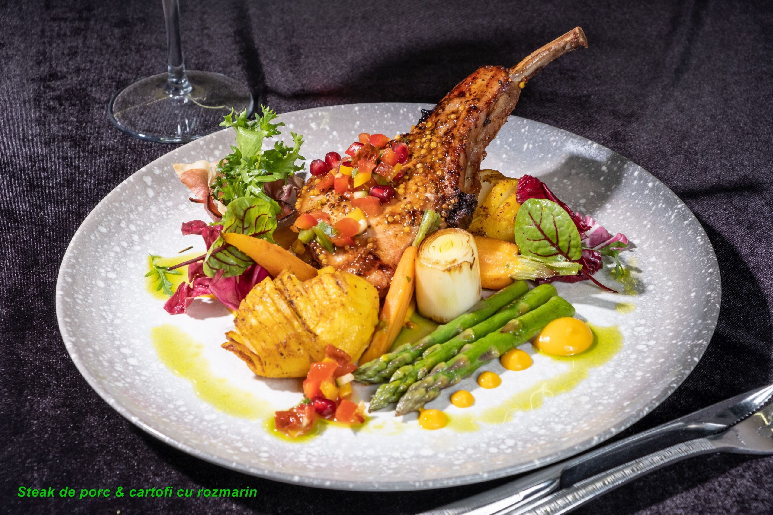 Cotlet de porc, cartofi cu rozmarin, piure de țelină, sparanghel, legume caramelizate